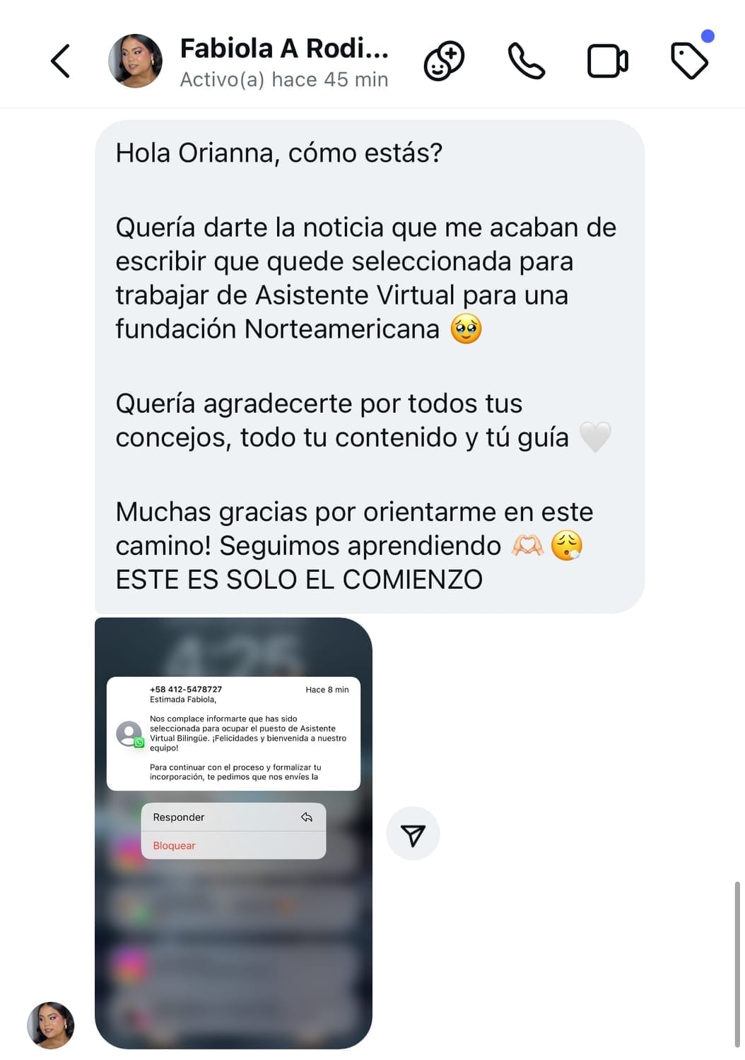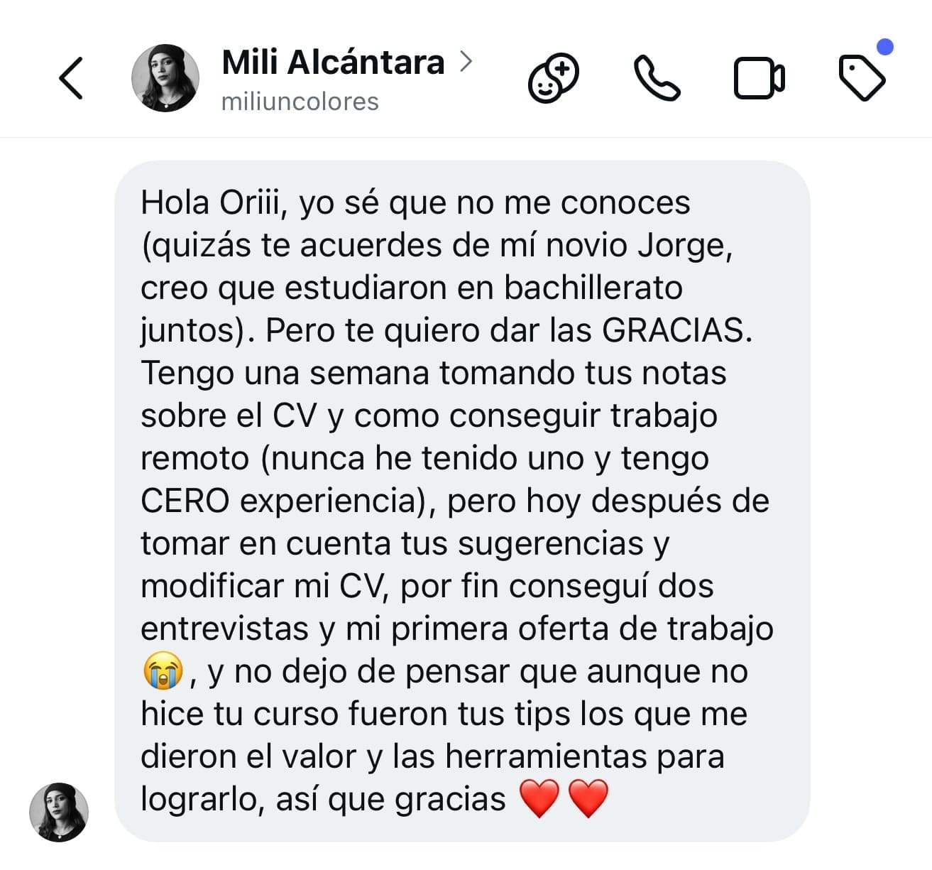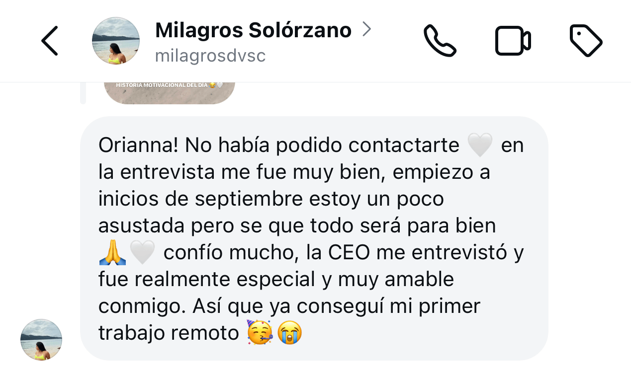 Depende de tu constancia y el tiempo que le dediques, pero mis alumnas lograron su primer trabajo remoto en un promedio de 3 semanas a 30 días.