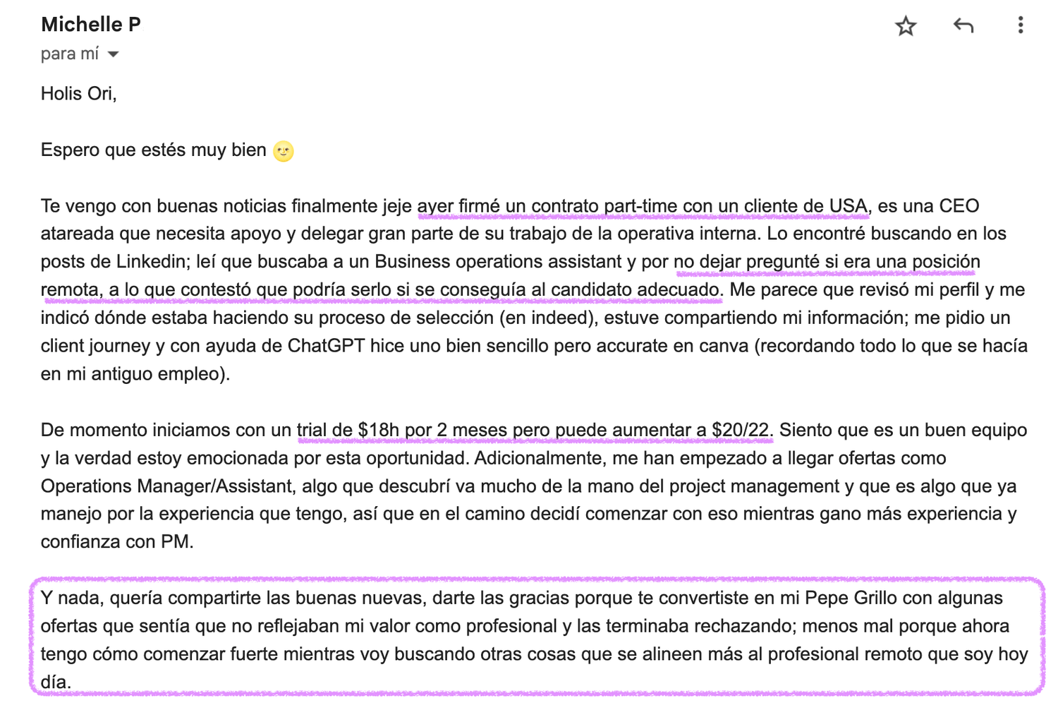 Vas a aprender a contar tu historia profesional de forma estratégica, a mostrar por qué tu experiencia sí encaja en el mundo remoto, y a posicionarte como la persona ideal para el puesto o proyecto que quieres, porque cuando logras eso...